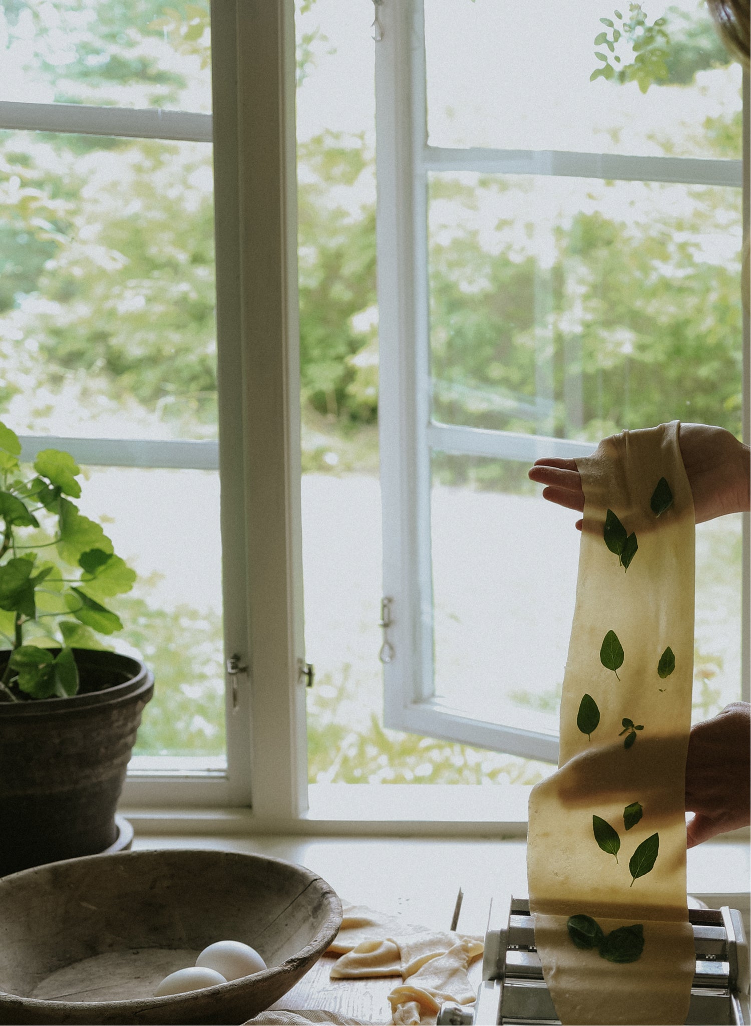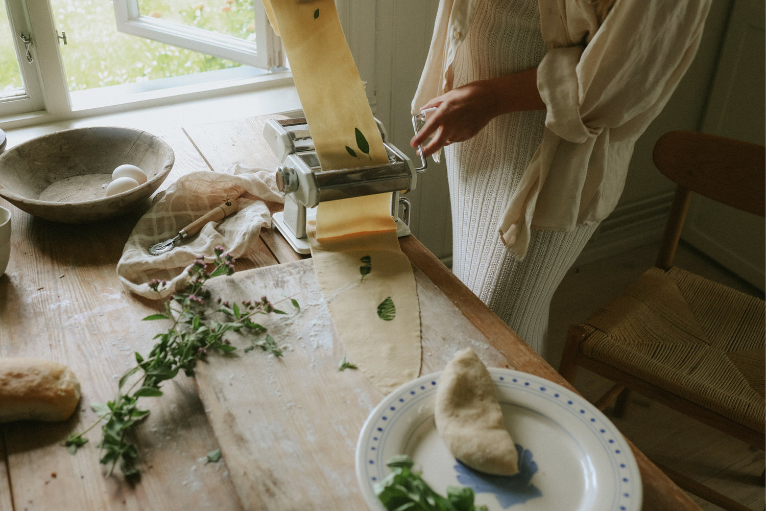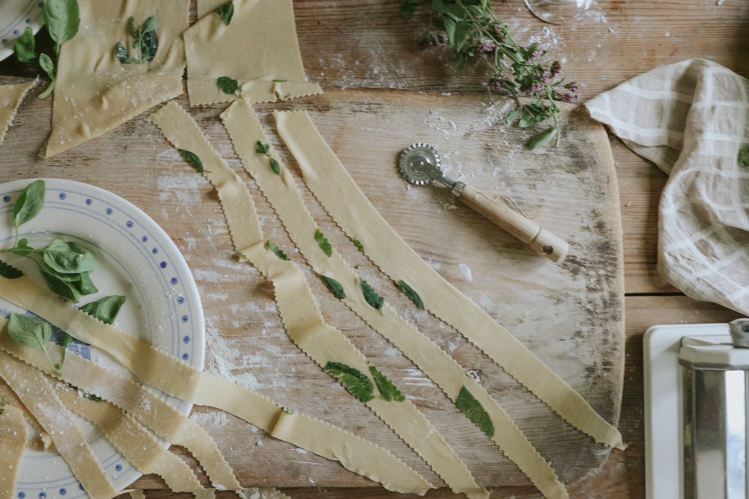 - Den Teig auf einem bemehlten Tisch dünn ausrollen oder eine Nudelmaschine verwenden.