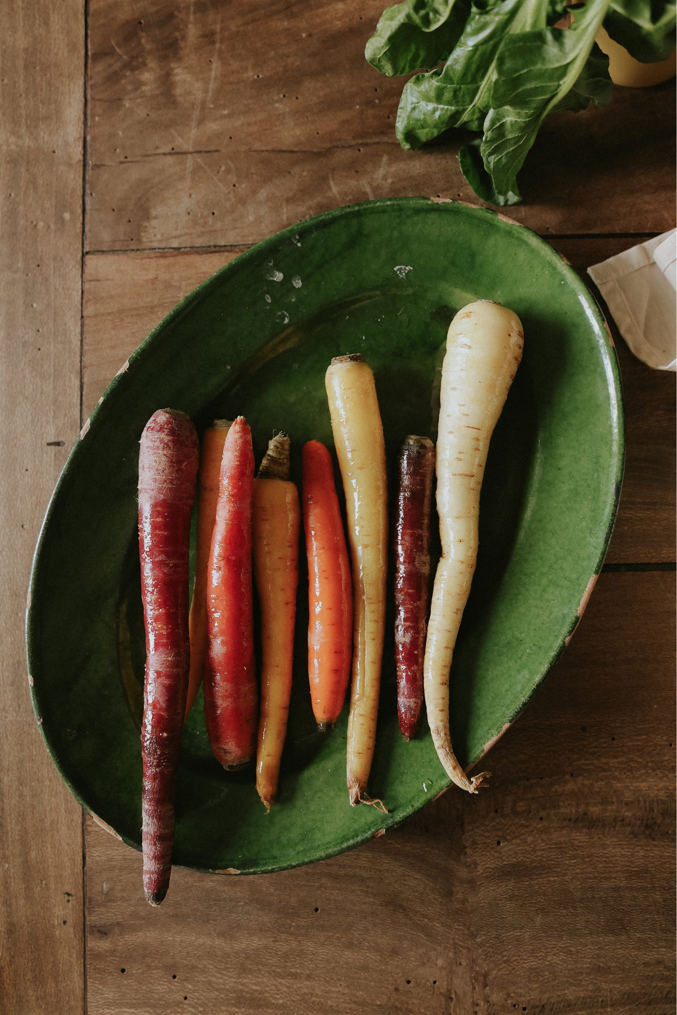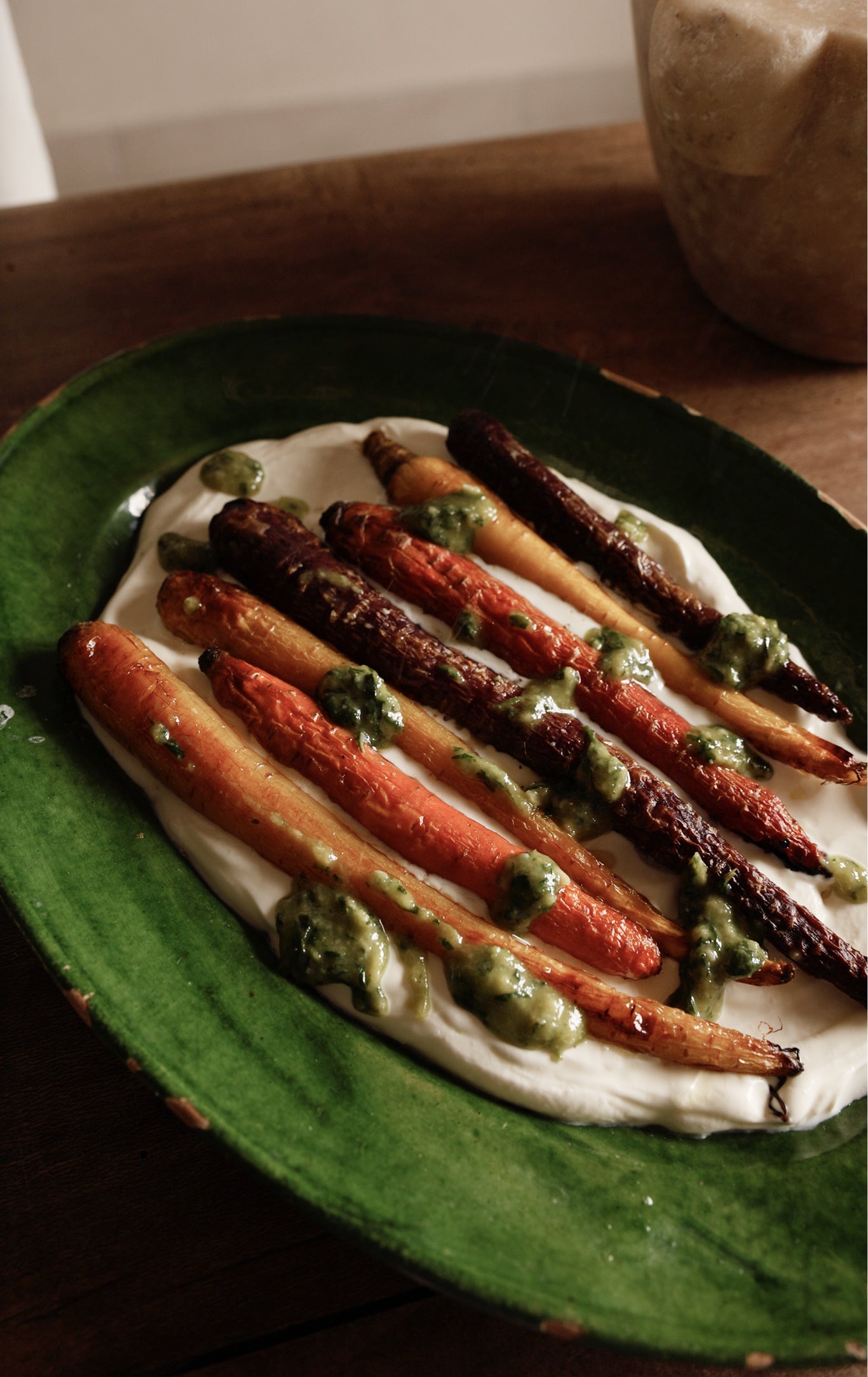 Geröstete Karotten auf säuerlicher Crème fraîche mit grünem Pesto