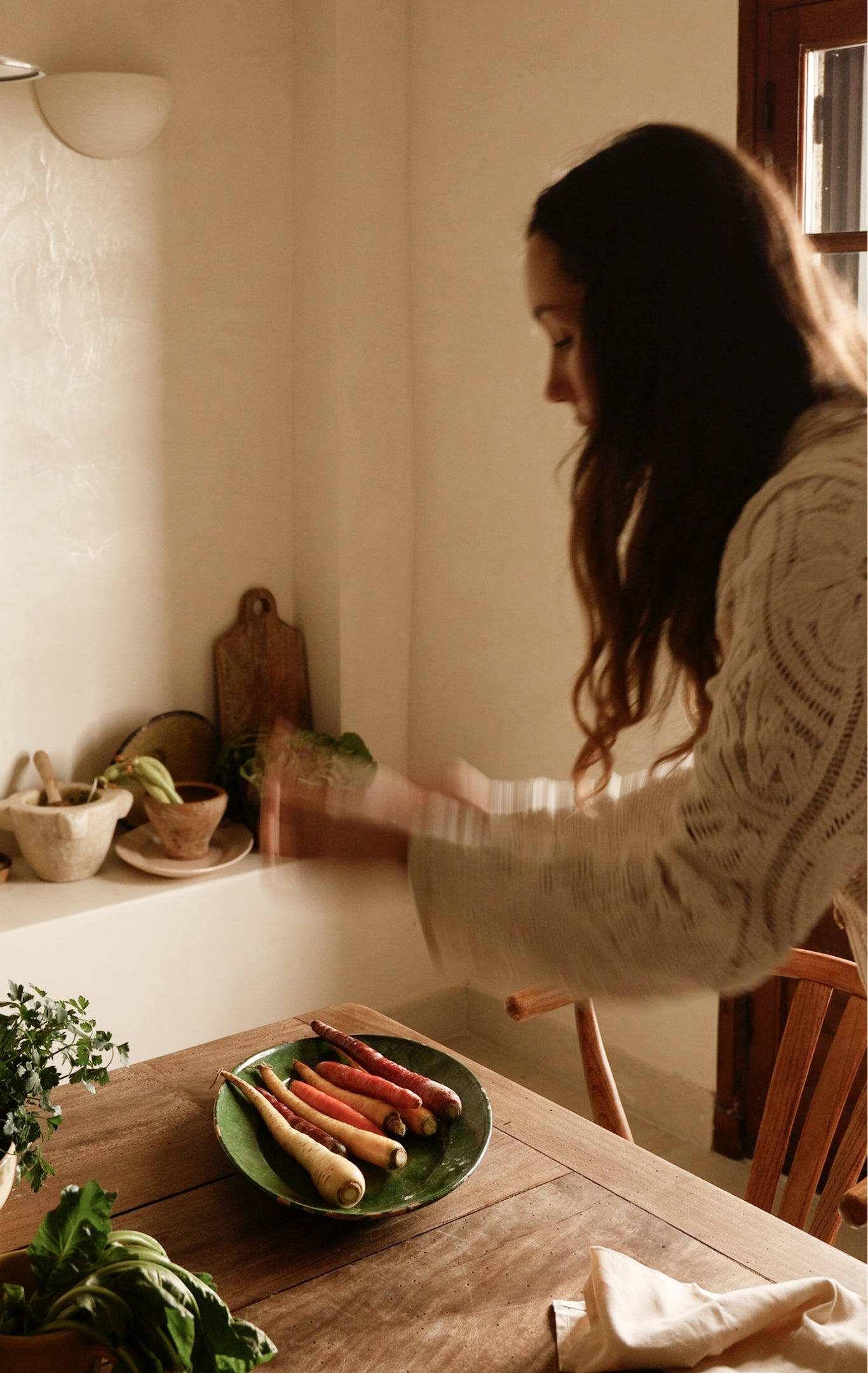- Verteil die Crème fraîche auf einer Platte. Leg die warmen Karotten drauf und gib ein bisschen Pesto dazu.