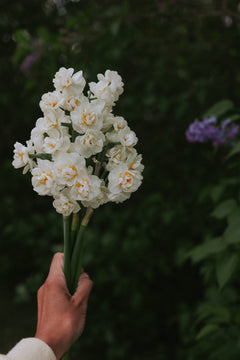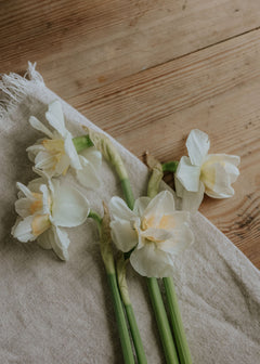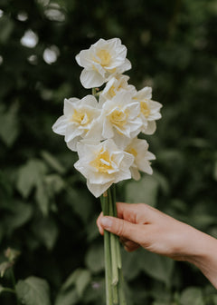 En sort som vi blev helt förälskade i när vi såg den på fälten nere i Holland. Underbara dubbla blommor med en mjuk krämvit mitt som matchar perfekt mot de lite mer elfenbensvita bladen. Den får nästan rosliknande blommor vilket gör den unik och häftig. Sorten blommar tidigt och ger kraftiga stjälkar uppemot 45 cm höga. Ännu en gång en sort som passar utmärkt att plocka in som snitt!