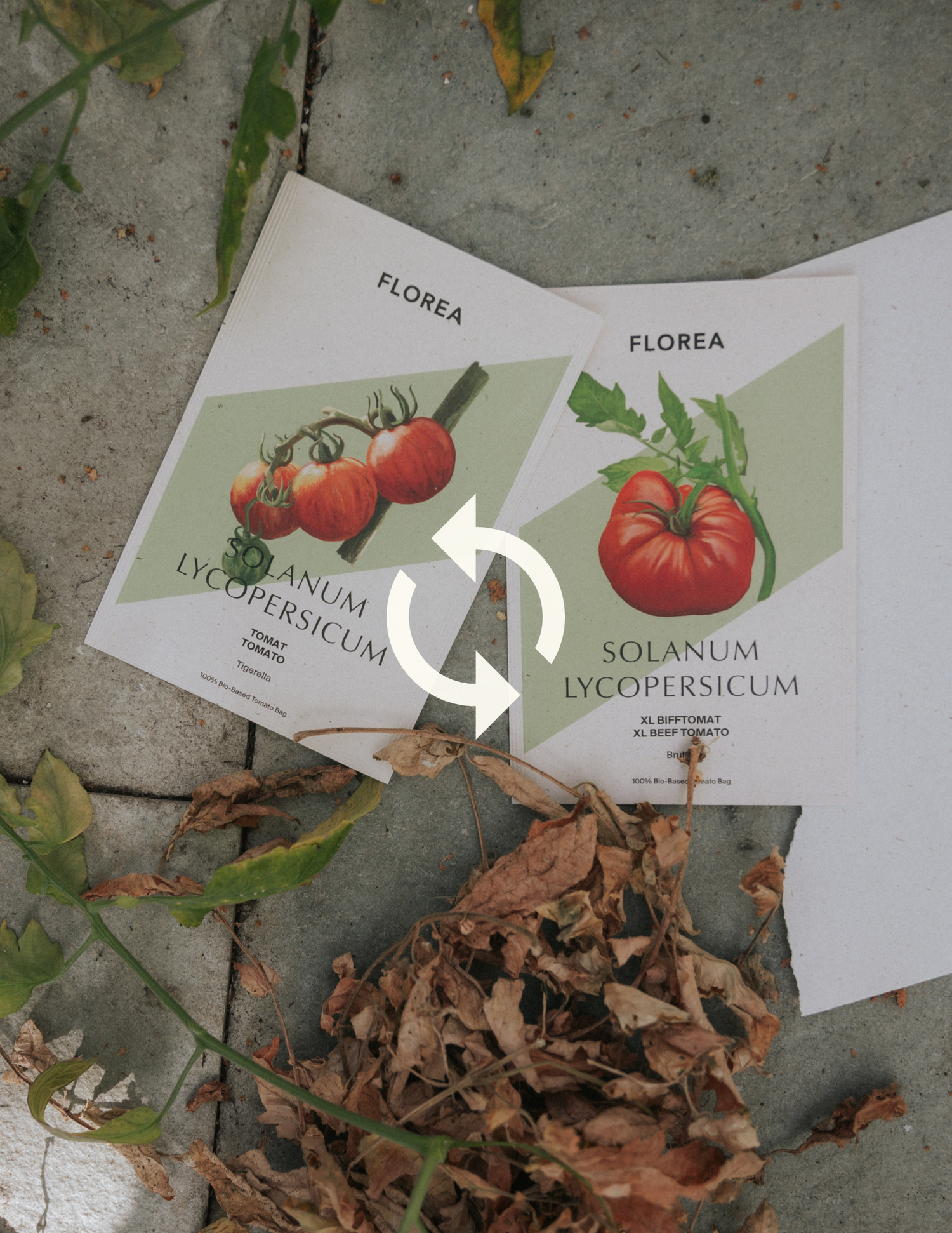 Tomato plants grown in the Netherlands are primarily for food retail (e.g. tomatoes for your local grocery store), and when the tomatoes are harvested and the plant is to be discarded, we instead choose to reuse the plants and create pulp. It's hard to believe, but the fibers in a tomato plant are actually well suited for making paper. In addition, the bags are completely plastic-free and can be recycled like regular paper. The tomato paper also has a very beautiful character, which is another plus.