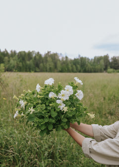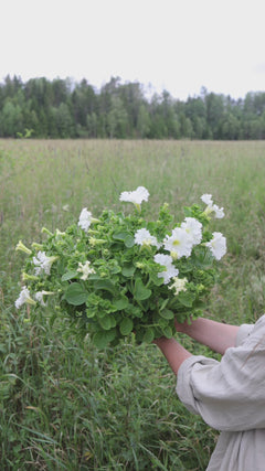 Petunia ‘White Double F1’ is an elegant and profusely blooming variety distinguished by its large, double flowers in a soft white tone. The lush petals form dense, almost rose-like blooms, sometimes with gently ruffled edges that give the plant a full and graceful appearance. The colour is crisp white, and the variety thrives beautifully in pots and hanging baskets, as well as in larger plantings where it can spread freely.