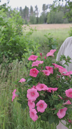 Petunia ‘Yvette F1’ is a free-flowering variety distinguished by its large, soft pink blooms with subtle coral undertones and a delicate darker veining towards the centre. The plant has a compact, well-branched habit that forms a dense, balanced shape, making it ideal for hanging baskets, containers and garden beds where it flowers abundantly all summer long.