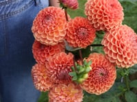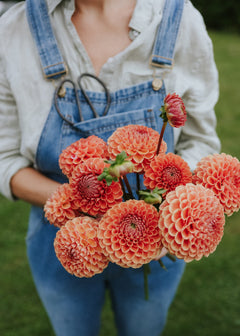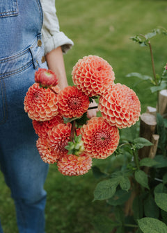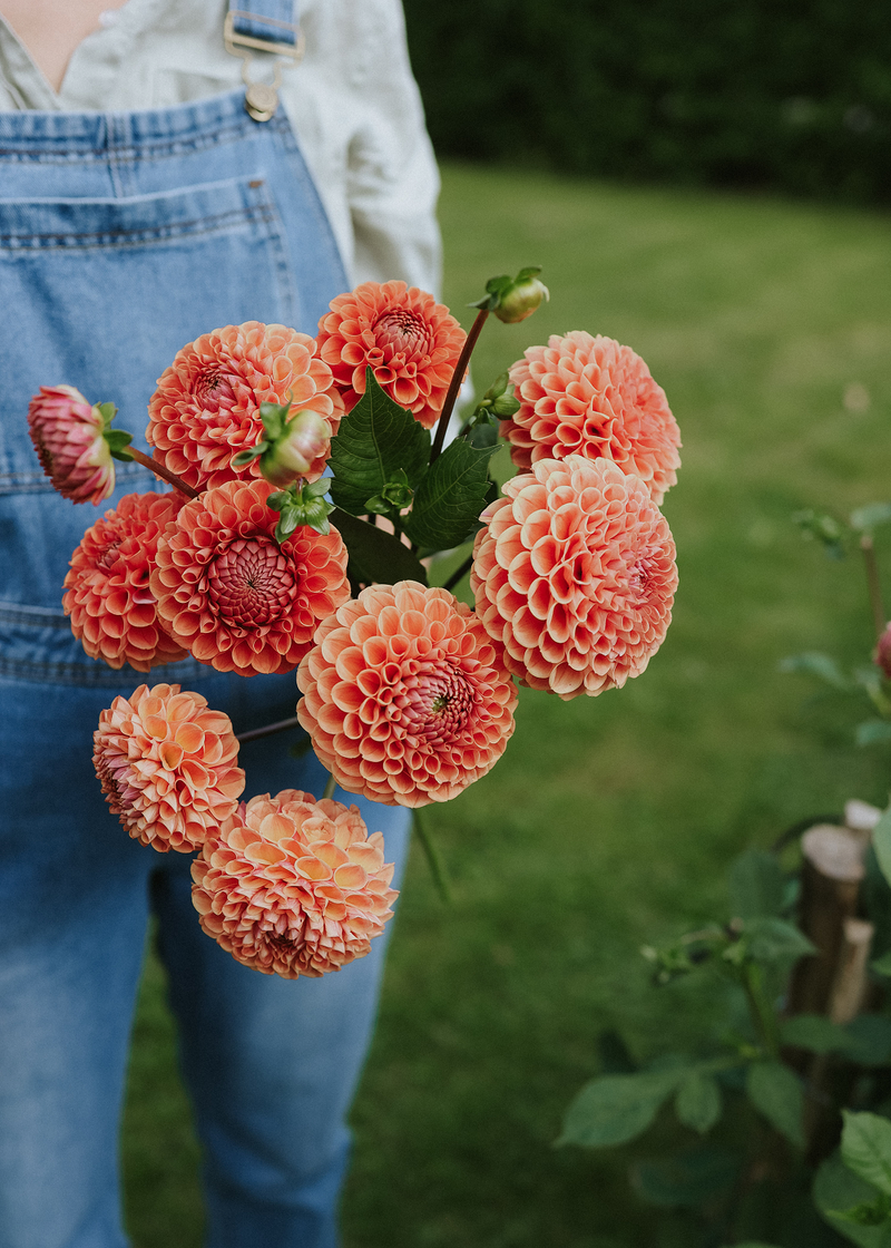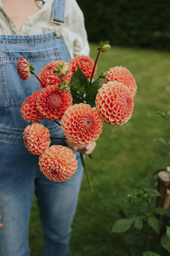 A true dahlia classic with dense, curved petals that together create the perfect flower ball. In warm shades of apricot and orange with a magical bronze-like sheen. Long and sturdy stems that are perfect for cutting. This variety produces an abundance of flowers throughout the season and will not disappoint you. The flowers have a long vase life, which is one of the many reasons we at Florea love this variety so much.