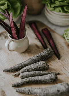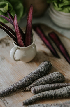 Dark purple delightful carrots with pointed roots and an enchanting taste. An incredibly sweet and flavorful carrot variety that is excellent for raw food, juices, salads, and stews. The taste is unique and the cool purple appearance is a big plus. Purple carrot puree, magical accompaniments to the grill platter, or purple carrot soup with a dollop of crème fraîche are just a few of the cool food creations you can make with this carrot variety.
