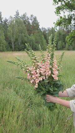 Foxglove ‘Dalmatian Peach’ is a variety with softly peach-coloured bells that rise along sturdy flower spikes.It belongs to the popular Dalmatian series, bred for early flowering already in the first year from seed. Dalmatian Peach is beautiful both in garden borders and as a cut flower, where its tall spikes add graceful height to any bouquet.
