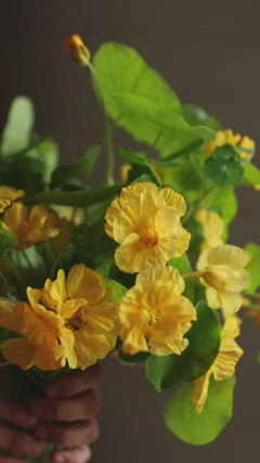 Nasturtium ‘Whirlybird Cream’ is a warm and cheerful variety that brightens up any space with its soft, creamy white blooms. The flowers have a gentle golden hue that gives them a sun-kissed look. This variety belongs to the much-loved Whirlybird series, known for its compact plants and abundant flowering. It is incredibly easy to grow and thrives almost anywhere – in pots, borders or hanging baskets. With enough light, it can even be grown indoors all year round, bringing a touch of summer warmth to the darker months.The flowers, leaves and seed pods are all edible and have a mild, peppery flavour. The pale petals make a lovely addition to salads, open sandwiches or as a simple decoration on a savoury tart.