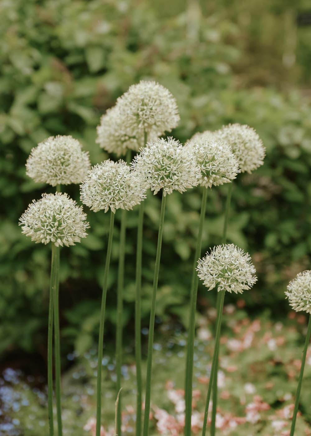 Allium comes in different colors, shapes, and sizes, and its flowers can be purple, pink, white, or blue. It ranges from large globe-shaped flowers to hemispheres with hanging flowers.