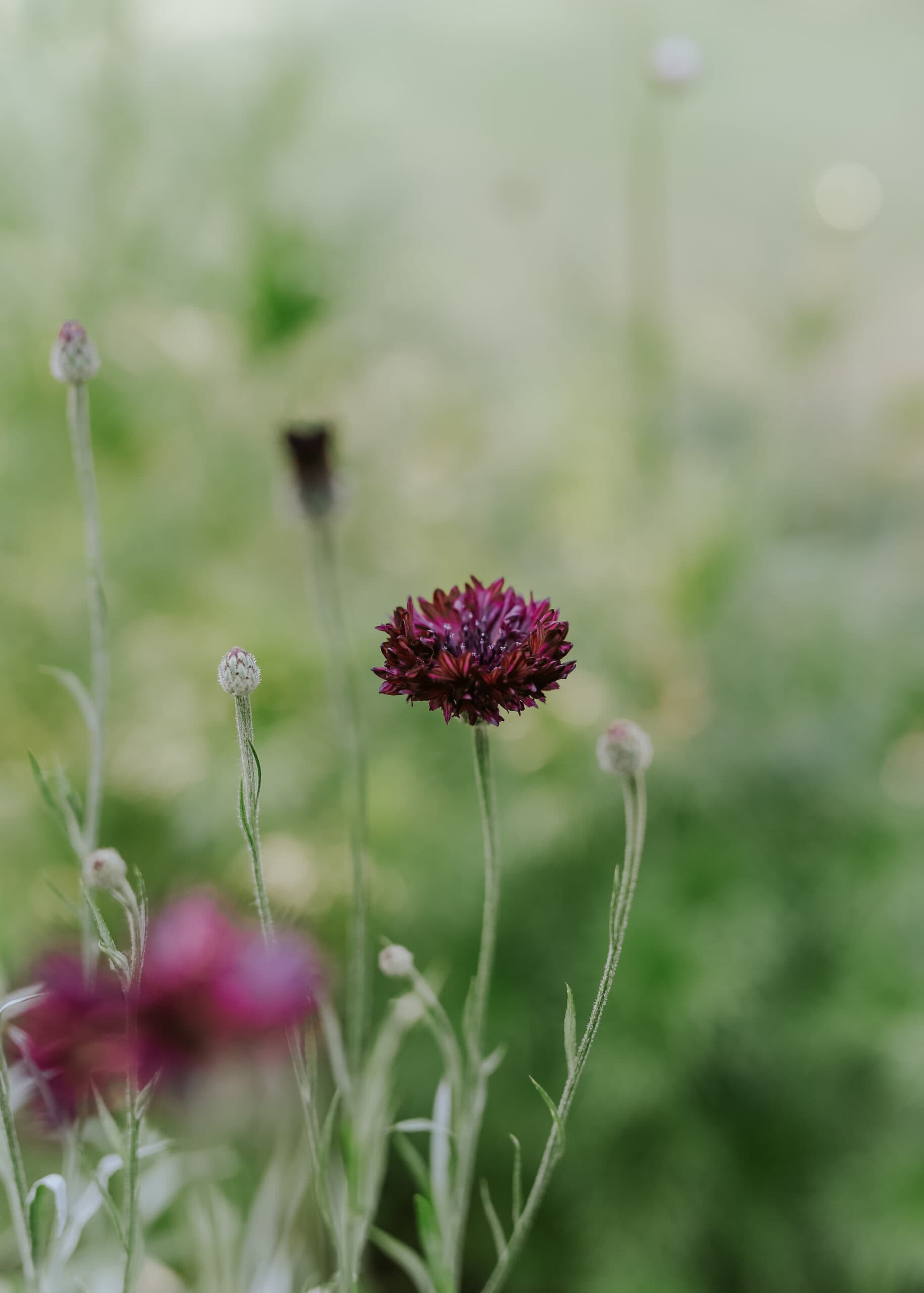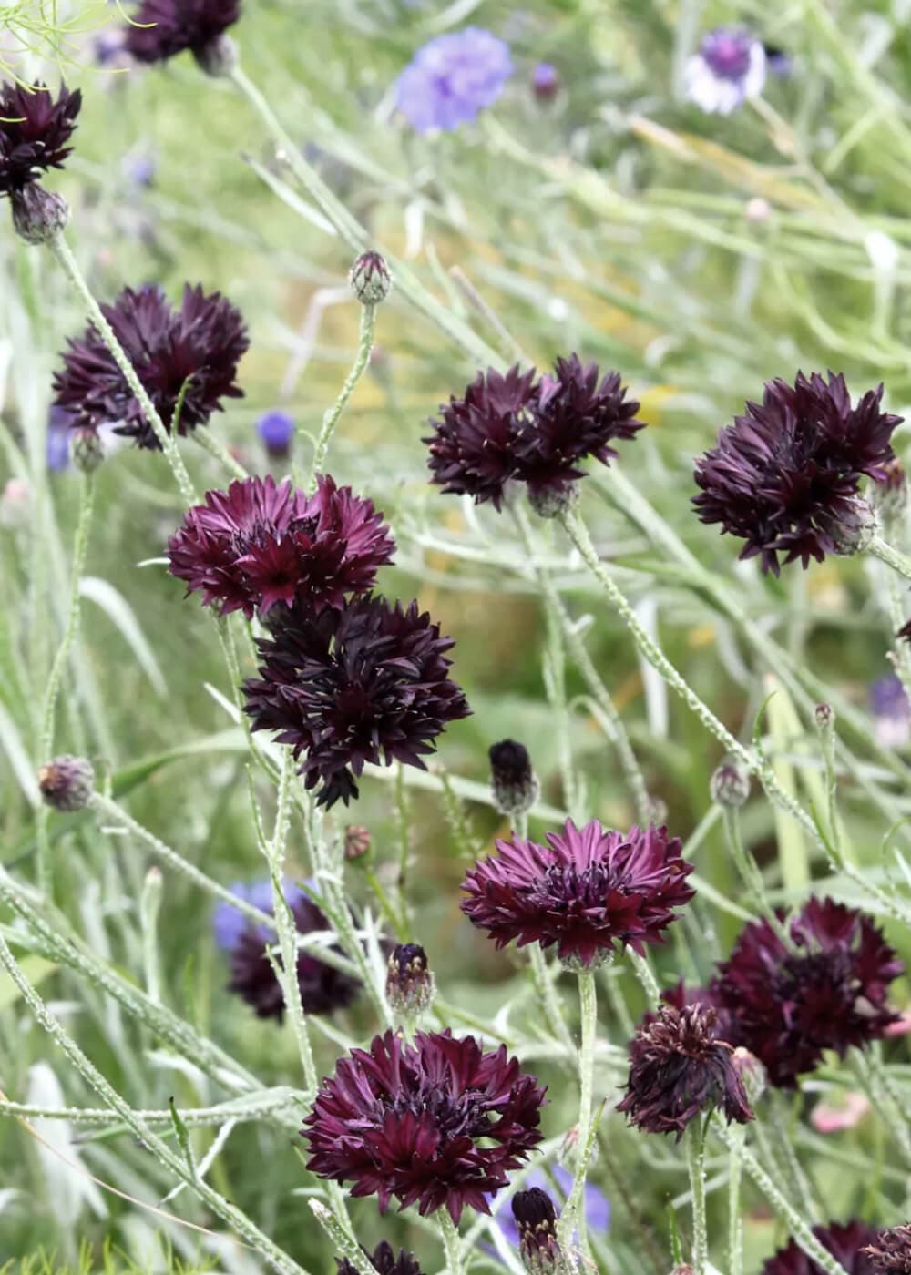 A enchanting and unique cornflower with dense and double flowers in a dark purple color. It is loved by all our pollinators and is a classic variety with a new and modern twist. The plant has a low and compact growth habit that is excellent for edging borders, planting boxes, and pots. Black ball is incredibly beautiful and magnificent in bouquets as freshly picked, but also as dried flowers. The striking and unique color makes this variety stand out and excel in wreaths, flower arrangements, and bouquets.