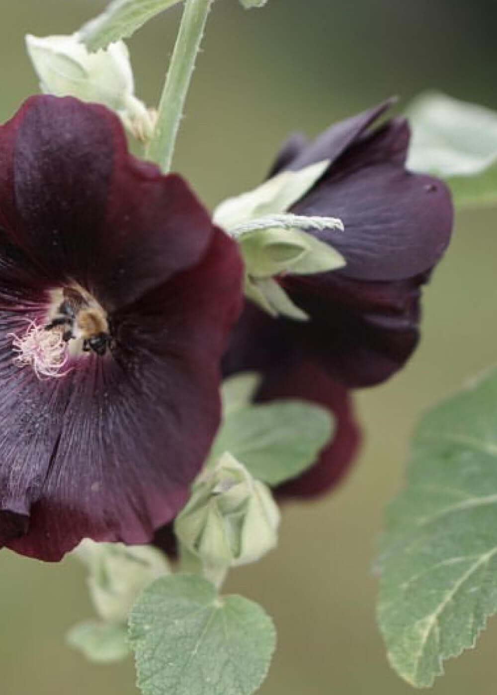 A magical hollyhock in a unique dark purple color with beautiful green foliage. Outstanding in bouquets and incredibly beautiful in borders. An incredible flower variety that is loved by both humans and pollinators. With its late blooming, hollyhocks are also called the queen of late summer in colloquial language, an impressive title that this variety certainly lives up to.