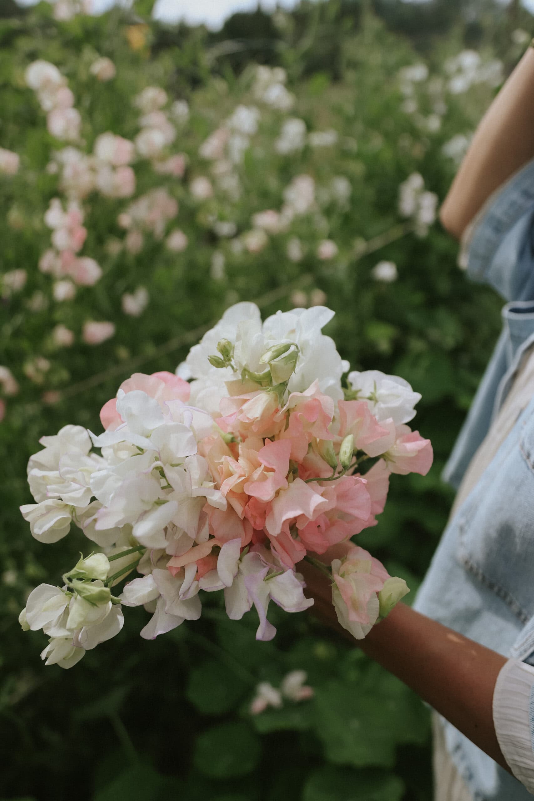 This enchanting sweet pea mix offers a romantic blend of soft shades of white and pink. With their fragrant petals and long stems, they are perfect for bouquets. Developed by our very own Anna Kubel, with a focus on color and bouquet-friendly qualities.
