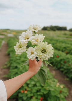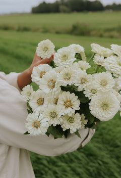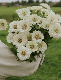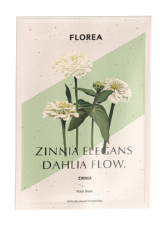 En magnifik Zinniasort med vackra dubbla blommor i en vacker vit färg med gröna bladverk. Sorten är lättodlad och har stadiga och styva stjälkar vilket gör den till den ultimata snittblomman. Den är otroligt tjusig att ha i buketter och passar fint ihop med andra sommarblommor. Sorten passar även utmärkt i rabatter eller andra typer av planteringar och passar bra samplanterade tillsammans med andra växter. En pålitlig sommarblomma som blommar ståtligt och praktfullt ända till frosten kommer. Polar bear är otroligt omtyckt och älskad av alla våra pollinatörer och är även en riktig favorit hos oss som arbetar på Florea.