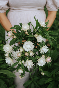 Låt oss presentera ”Jätteetternell - Silvery White”, ett väldigt välkommet inslag i eternellfamiljen hos oss på Florea. Sorten får massvis med stora papperslikandeblommor i olika former och storlekar lite beroende på hur länge de får sitta på plantan. En magisk bukettkomponent men som är precis lika vacker solo i ett fång tack vara den vita skimrande färgen. Det underbara med eterneller är att de även går att torka och Silvery White är inget undantag, den skördas och hängs upp och ner för bästa torkresultat.