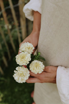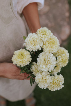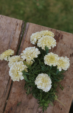 Tagetessorten Vanilla är en ljuvlig sommarblomma med det där lilla extra. De fylla blommorna har en krämvit till isabellinagul färg tillskillnad från de vanligare tagetessorterna. Passar utmärkt för krukodling och känd för sin speciella lite kryddiga doft. Blommorna är ätbara och används ofta som dekor på både maträtter och bakverk under sommarsäsongen. Ett frukosttips är att torka blombladen för att sedan använda i ugnsrostad müsli, både gott och vackert.
