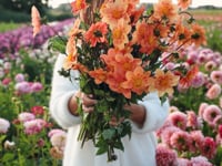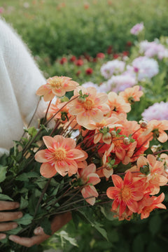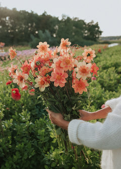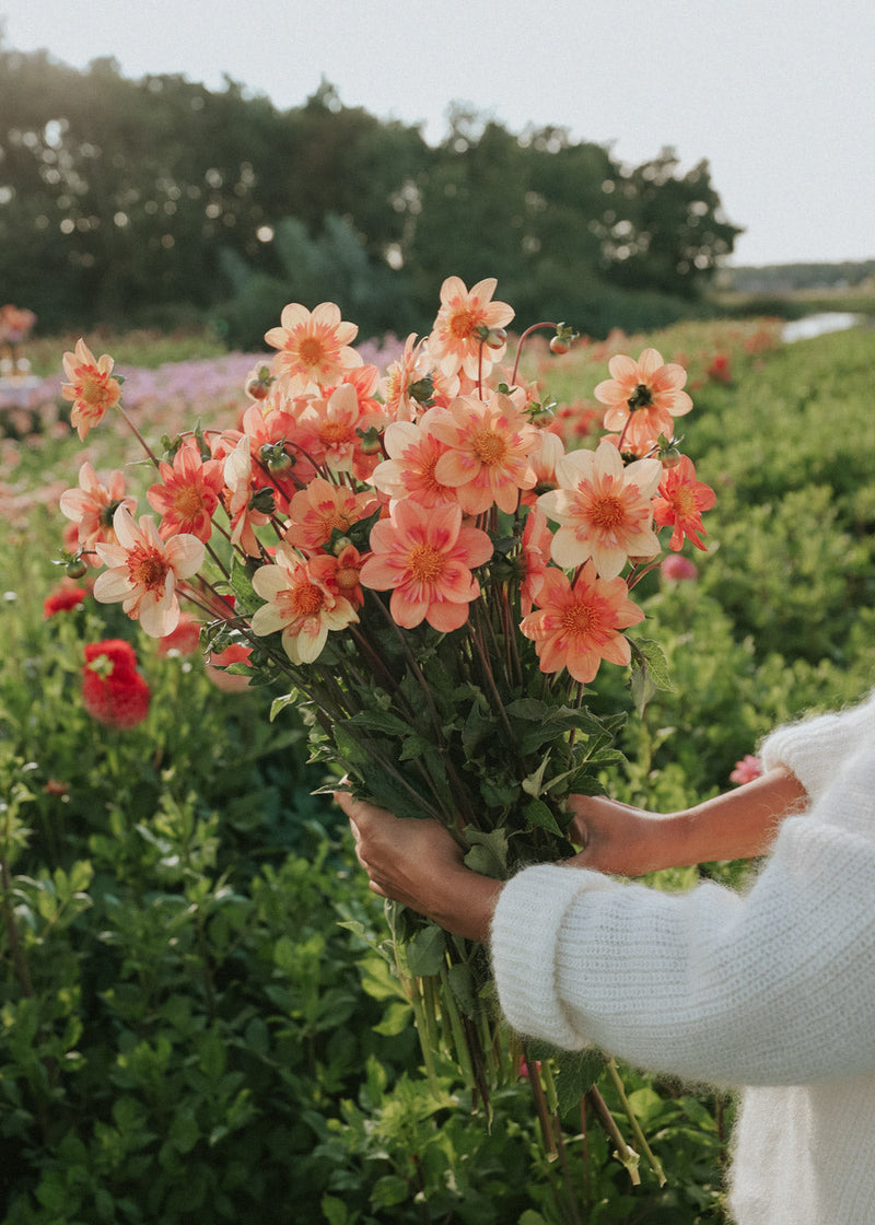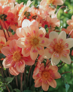 Kelsey Annie Joy är en jättesöt enkelblommande dahlia med en liten krans av rosa minikronblad tillsammans med aprikosfärgade blad och en gul mitt. En perfekt Dahlia för snitt med långa stjälkar och riklig blomning under hela säsongen. Vi älskar den här Dahlian och dess spännande färger.